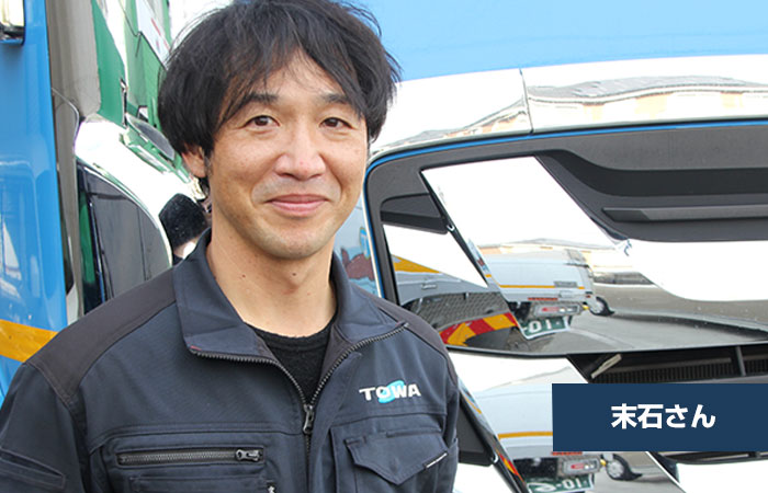 以前は倉庫内で仕分け、ピッキングの仕事をしていたのですが、一般貨物を扱うドライバーとして働きたいと思い、1年前に転職しました。現在は平ボディのトレーラーの乗務員として働いています。